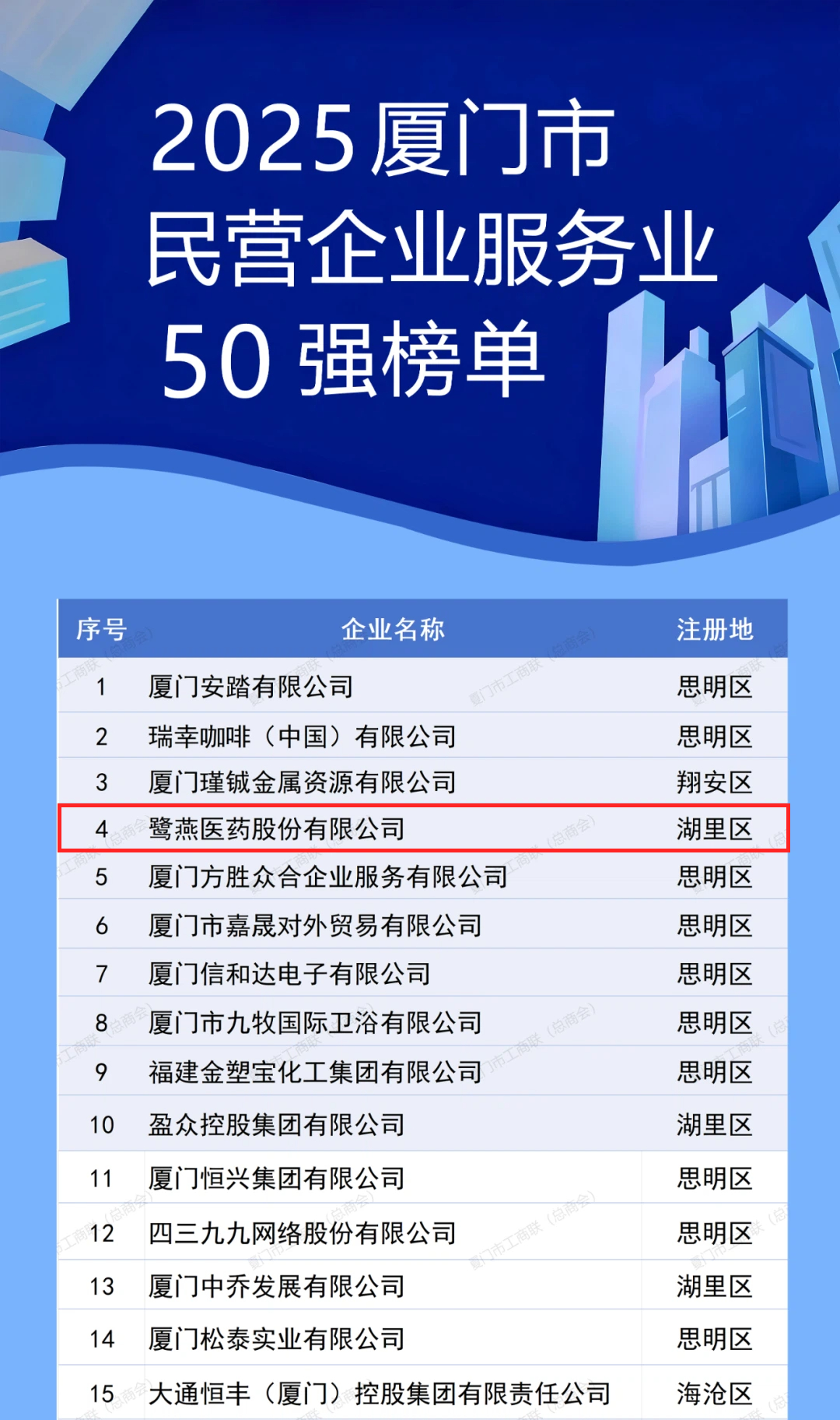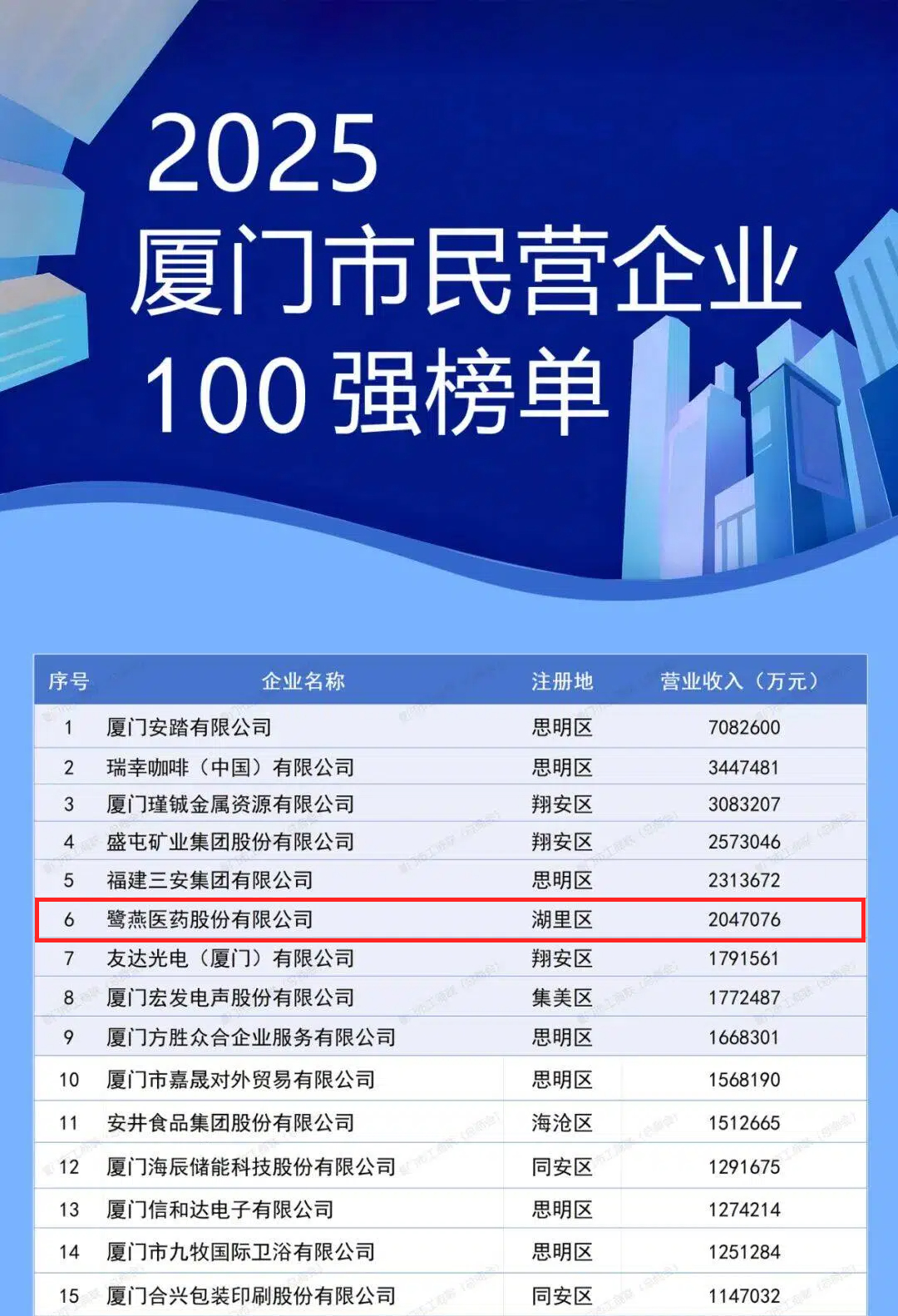 11月1日上午,2025年廈門企業(yè)家日大會(huì)召開。大會(huì)發(fā)布了2025廈門市民營(yíng)企業(yè)100強(qiáng)系列榜單,介紹了廈門市民營(yíng)經(jīng)濟(jì)發(fā)展態(tài)勢(shì)和營(yíng)商環(huán)境建設(shè)成效。鷺燕醫(yī)藥股份有限公司憑借上市企業(yè)綜合實(shí)力,榮膺“2025廈門市民營(yíng)企業(yè)100強(qiáng)”第6位,以及“2025廈門市民營(yíng)企業(yè)服務(wù)業(yè)50強(qiáng)”第4位。
